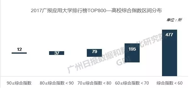 前800强本科高校的综合指数分布主要有如下特点:第一,高校间综合指数评分差距较大;第二,综合指数的“尖端”和“中端”高校数量偏少,477所高校综合指数在60以下。具体表现如下:90(包含90)以上的有12所高校,80-90(包含80)有37所高校,70-80(包含70)有79所高校,60-70(包含60)有195所高校。