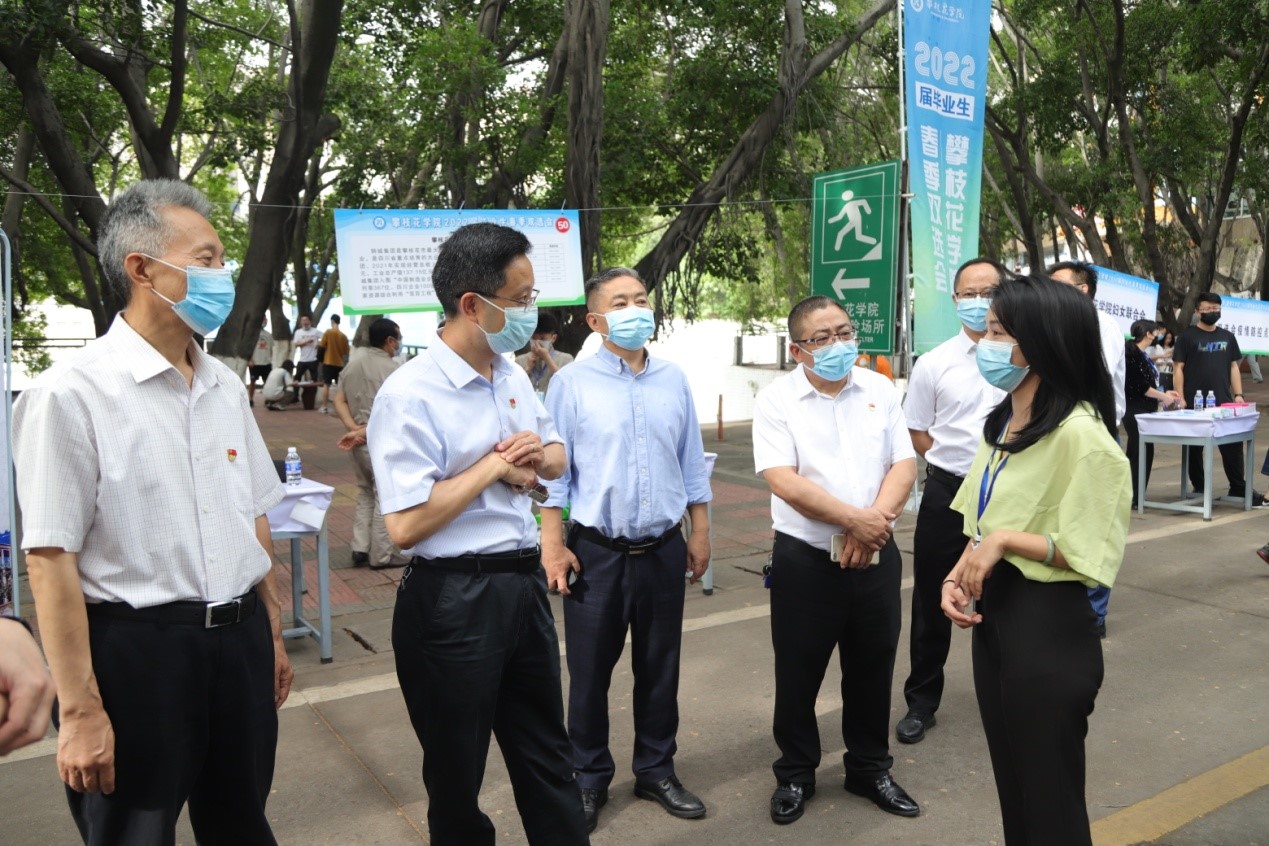 校党委书记王斌,校党委副书记、校长王曙光,副校长王兵,市人力资源社会保障局党委委员、市纪委监委驻市人社局纪检监察组组长杨芯、攀枝花就业创业促进中心和攀枝花市人才服务中心相关负责人亲临双选会现场,看望参会单位及工作人员,认真了解了企业发展的现状、招聘需求及对于学校人才培养工作的意见建议,并就相关招聘情况、人才需求、职业发展等方面进行了深入交流。