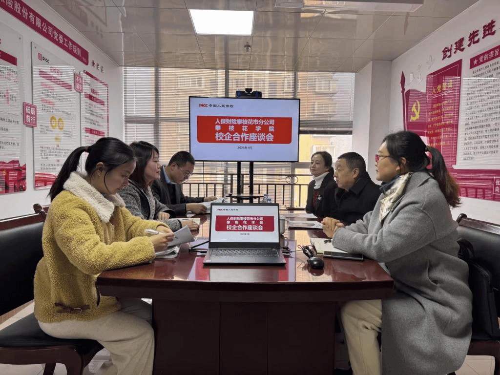 在人保财险攀枝花分公司会议室,文学院一行与综合部经理毛艺霖、农险部经理卢德飞等进行了深入座谈。文学院领导介绍了学院的专业特色、人才培养成果及此次访企的目的。公司负责人则详细阐述了用人制度、薪酬待遇、职业发展规划等内容。双方就学生实习岗位安排、就业招聘流程等工作展开深入交流,并就共建实习基地、人才输送与培养需求达成了初步共识。