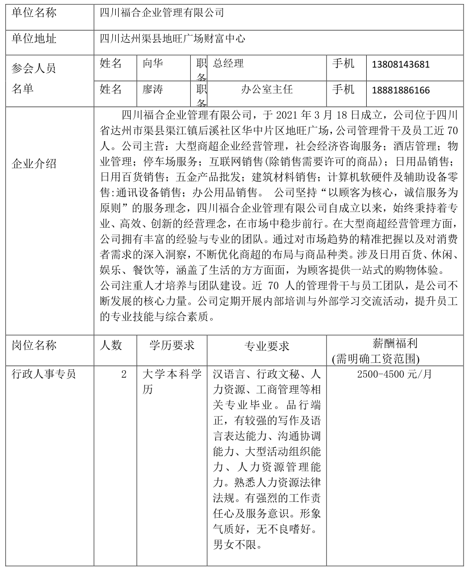 四川福合企业管理有限公司招聘简章