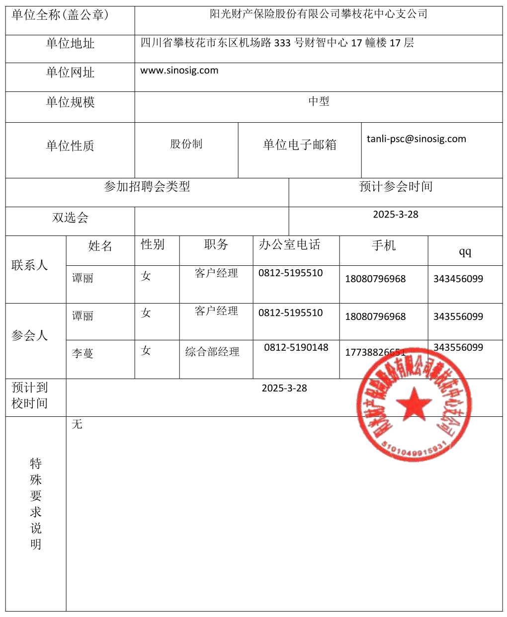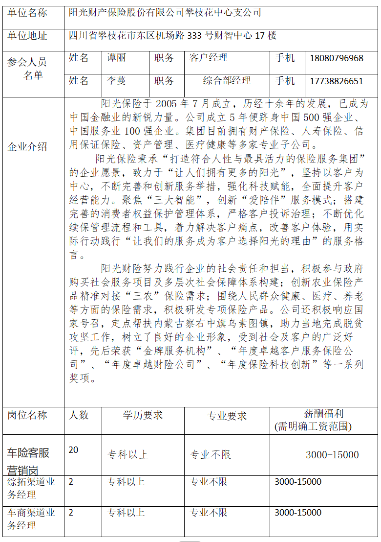 阳光财产保险股份有限公司攀枝花中心支公司招聘简章