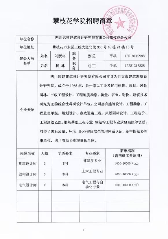 四川远建建筑设计研究院有限公司攀枝花分公司招聘简章