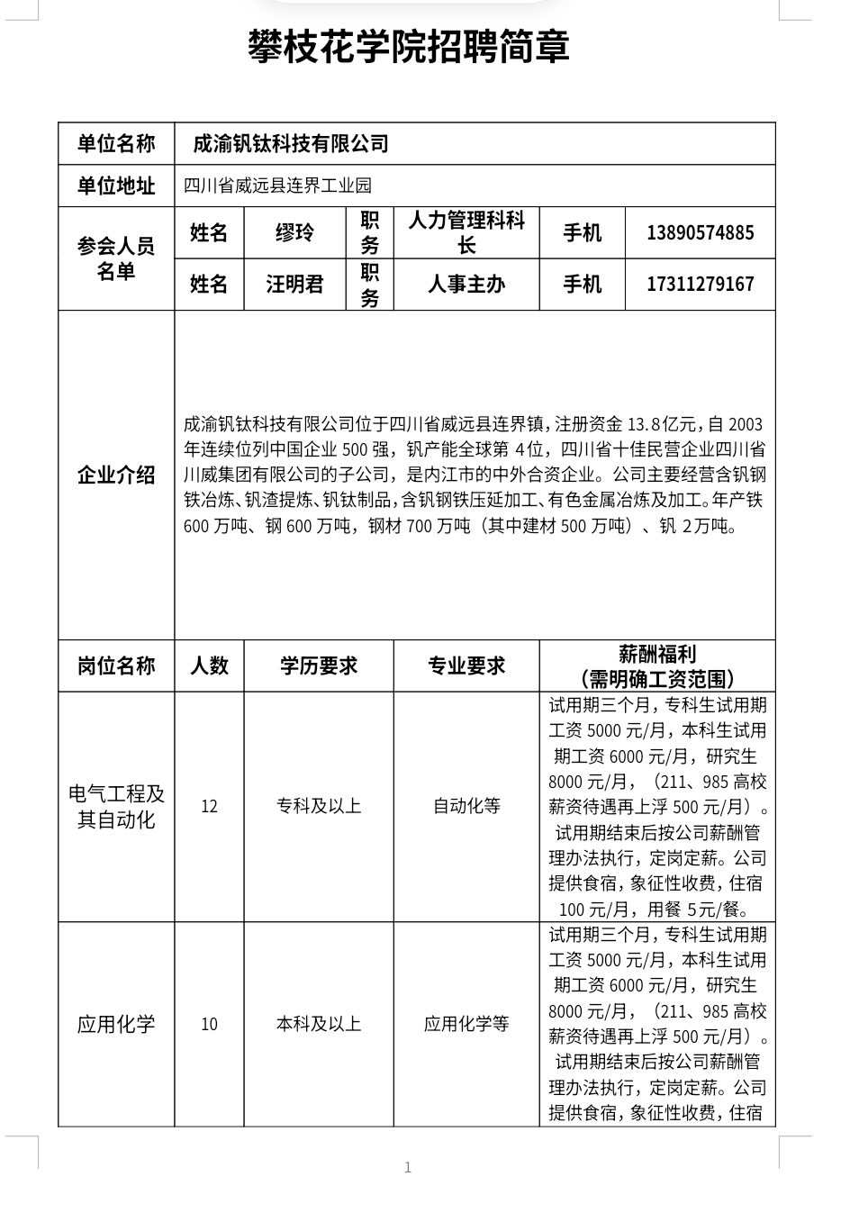 成渝钒钛科技有限公司招聘简章