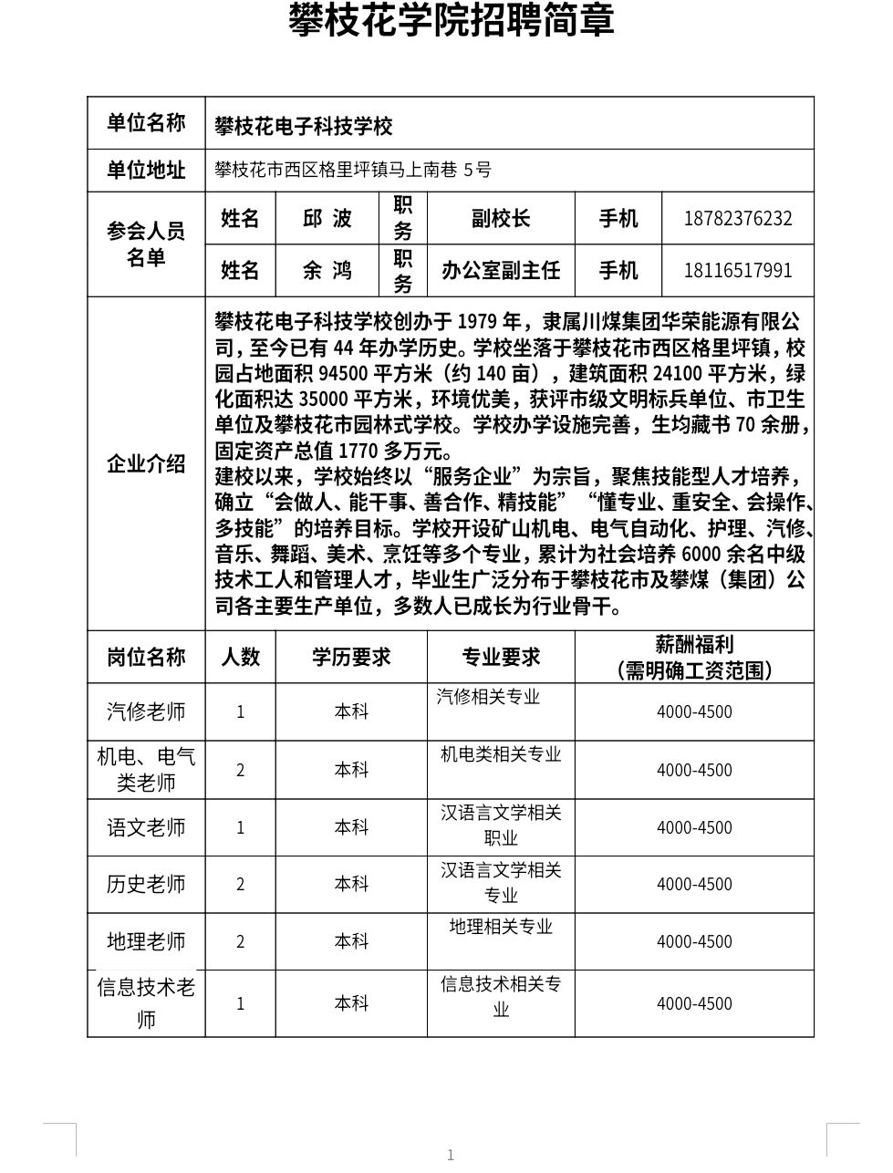 攀枝花电子科技学校招聘简章