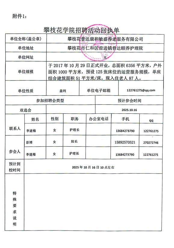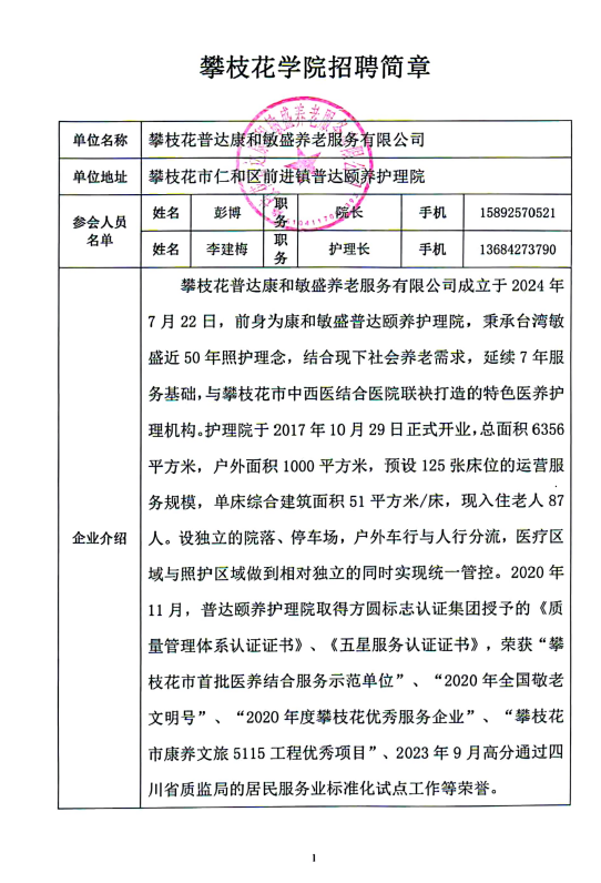 攀枝花普达康和敏盛养老服务有限公司招聘简章