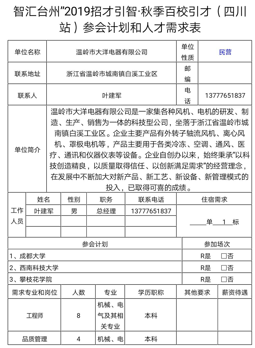 温岭市大洋电器有限公司招聘简章(10.29 台州专场招聘会)