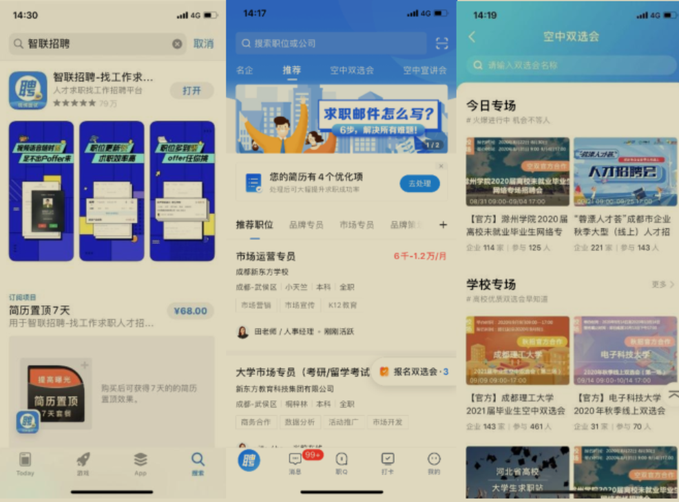 应用商店搜索“智联招聘”,下载智联招聘 APP,进行学生账