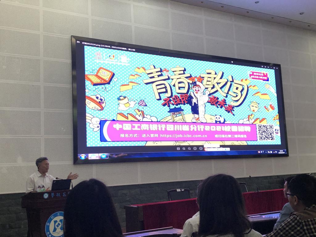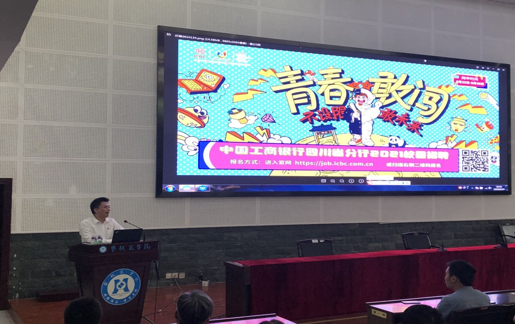 2020年9月24日,中国工商银行四川省分行2021校园招聘会在学校图书馆二楼学术报告厅举行。此次招聘会以现场讲解、提问互动等相结合的形式,让同学们快速、直观地了解到了该公司。招聘会由工商银行行长时友主讲,此外校长王曙光和招生就业处处长刘东康老师也参与了讲话。此次校园招聘会共有150多人积极参与。
