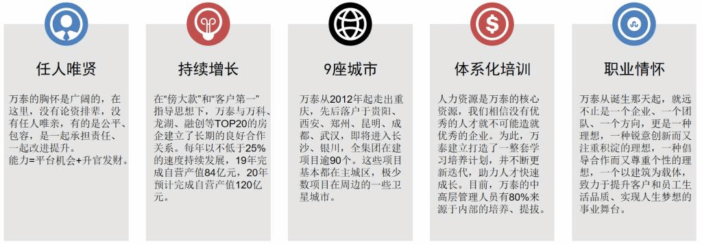 “注重人才的培养和发展”一直是万泰对待人才的态度。这不仅仅是万泰主观上的一厢情愿,更是万泰“直营”的业务模式和“优质低价、三大深耕(城市深耕、客户深耕、项目深耕)、最佳客户感受”的竞争策略决定的。同时,万泰也有重视人才、珍惜人才的基因和文化。公司早在2007年就开始走进校园,招募对建筑行业有热情、有抱负的学子。如今,更是将“明日之星”招募计划作为公司战略级的人才管理工作。