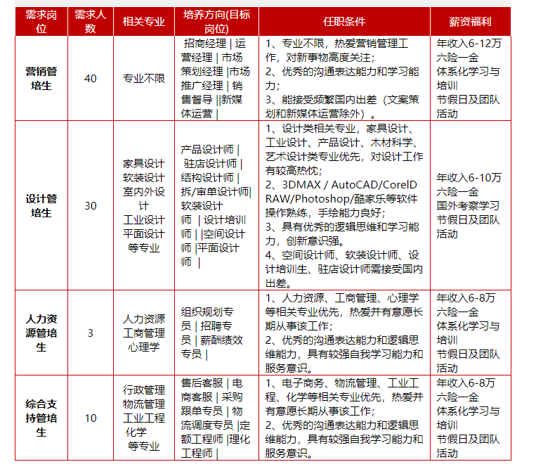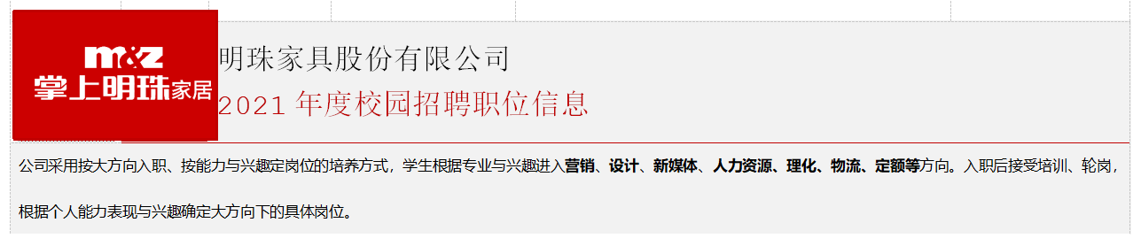 掌上明珠家居2021校园招聘正式起航,期待你的加入。详细岗位信息见下表: