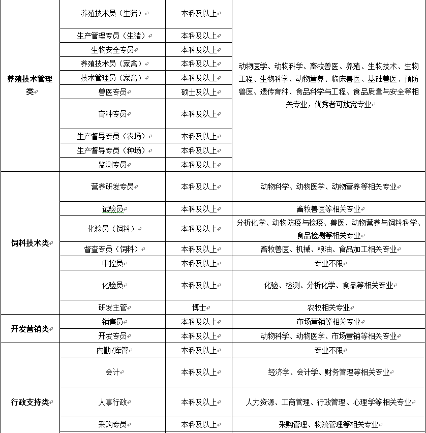 (一)技术类岗位专业不限,动物医学、动物科学、畜牧兽医、养殖、生物技术、生物工程、生物科学、动物营养、临床兽医、基础兽医、预防兽医、遗传育种、食品科学与工程、食品质量与安全等相关专业优先。