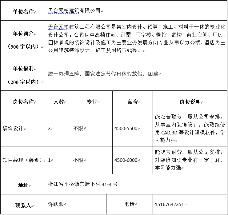 天台元柏建筑有限公司招聘简章