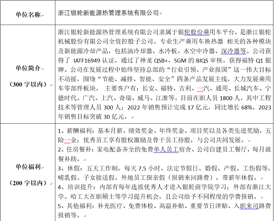 浙江银轮新能源热管理系统有限公司招聘