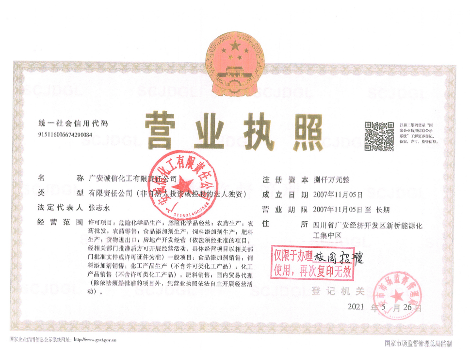广安诚信化工有限责任公司是河北诚信集团有限公司全资子公司。河北诚信集团有限公司是拥有九家全资子公司的集团公司,员工10000余人。产品远销南北美、欧洲、亚洲、南非等几十个国家和地区,在国际上享有极高的信誉和知名度,是一家经济实力强、发展后劲足的股份制化工企业集团。位居中国民营企业500强第332位,中国石油和化工企业500强第60位、中国精细化工百强第3位、中国石油和化工民营企业百强第21位。