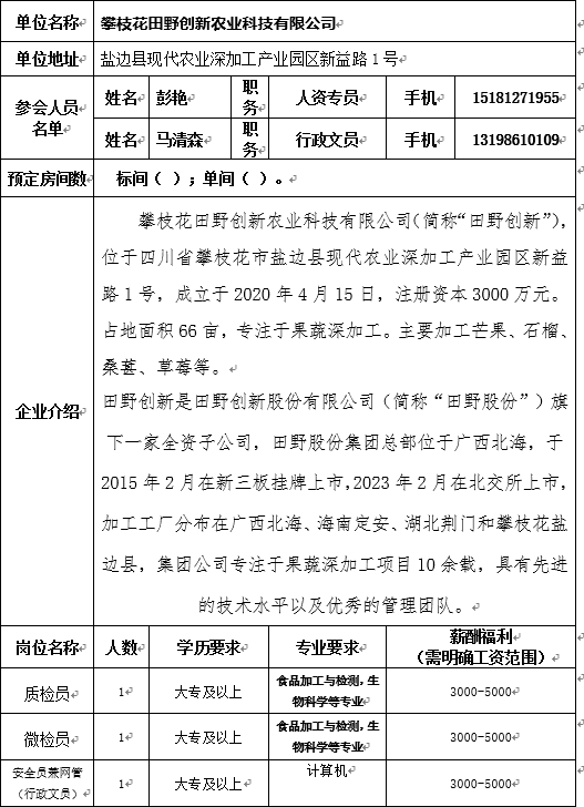 攀枝花田野创新农业科技有限公司招聘简章