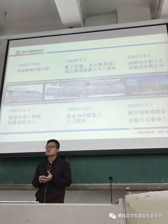 中铁十八局于2018年11月18日下午2:00,在二教2-1进行校园专场招聘会。有三十余名攀大毕业生携带自己的简历前来。宣讲人冯云龙在大会开始时播放集团宣传片,讲述了集团的发展与现状,让毕业生们对集团有了一个大概的了解。紧接着宣讲人提到了公司荣获的奖项,并介绍了公司对待员工的薪资福利。