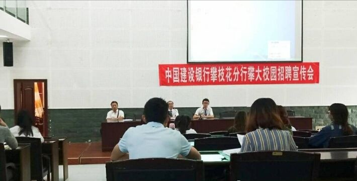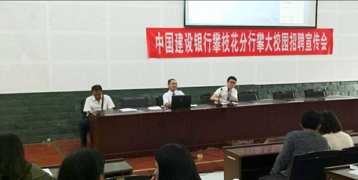 2017年10月17日中国建设银行攀枝花分行在攀枝花学院图书馆二楼学术报告厅举行校园专场招聘会。此次大会的参会人员有中国建设银行攀枝花分行人力资源部的王经理和李成学长及50余名攀大学子。