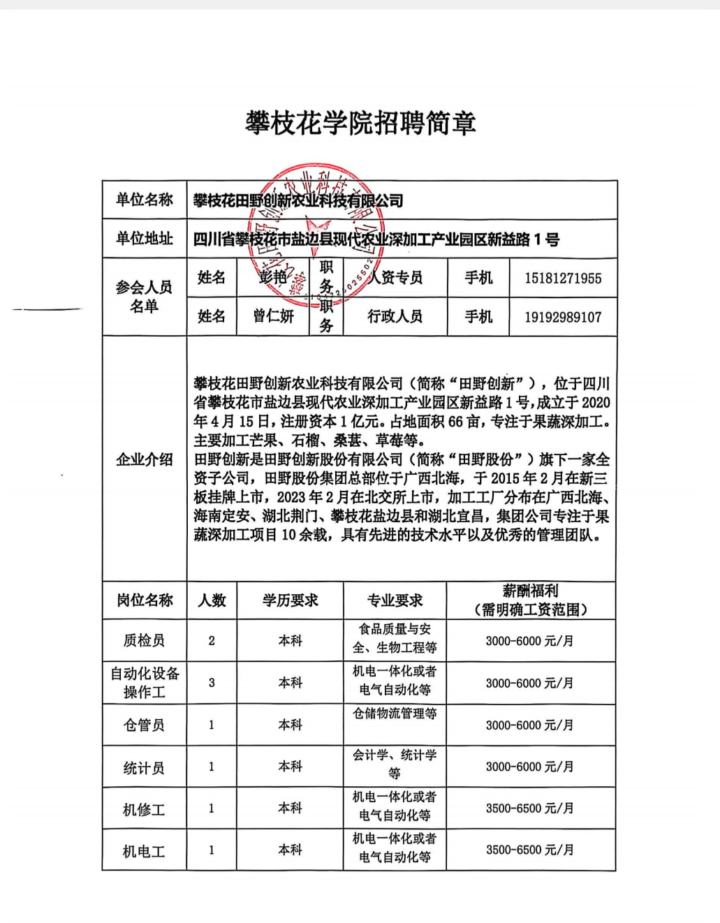 攀枝花田野创新农业科技有限公司招聘简章